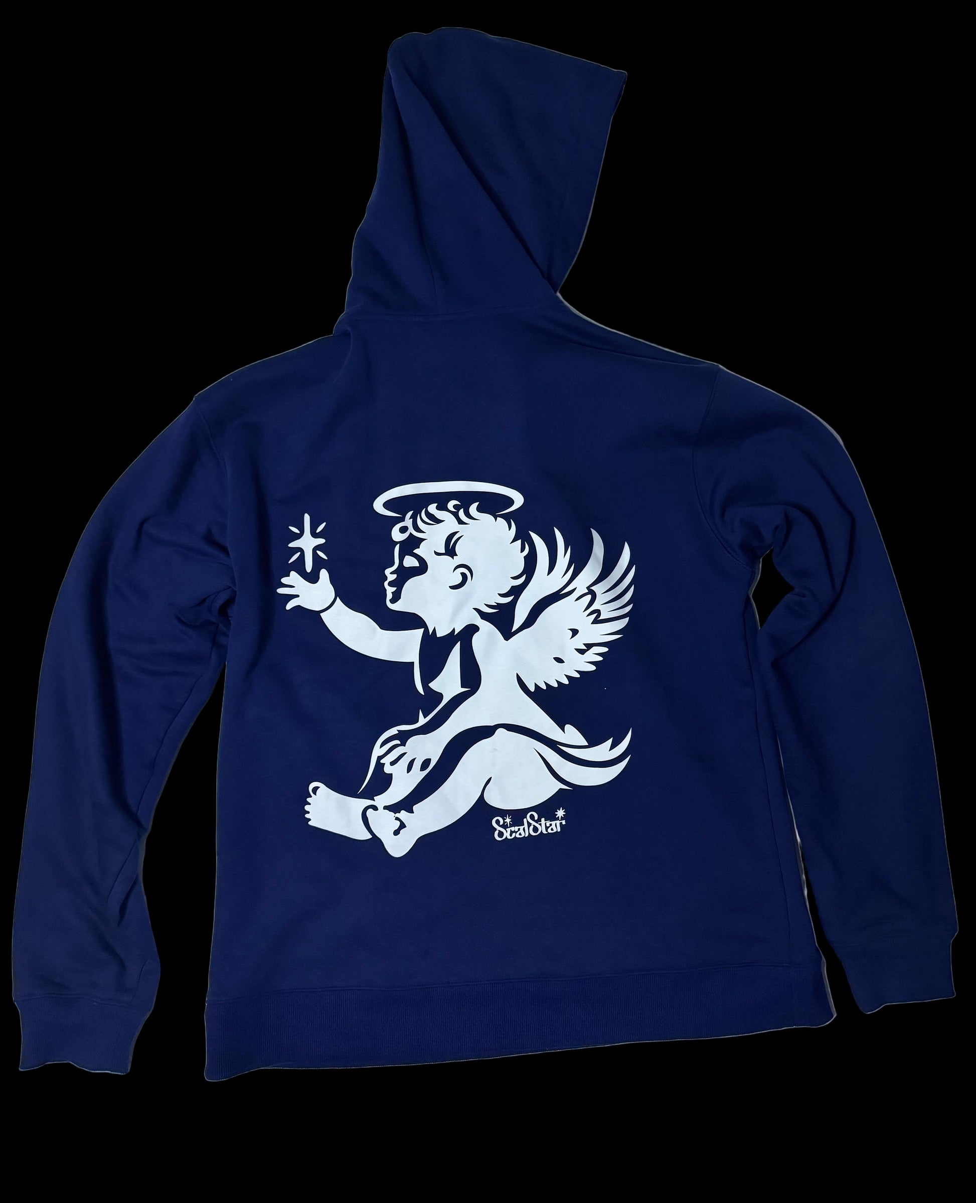 The Baby Angel ScalStar Hoodie features the ScalStar logo prominently on the front and a striking baby angel design on the back. Crafted in a rich navy blue, it offers a slightly oversized fit for comfortable layering. Ribbed cuffs add durability and a polished finish, while the roomy hood provides warmth and style. This hoodie combines thoughtful design with quality construction, making it an essential piece for casual and streetwear collections.